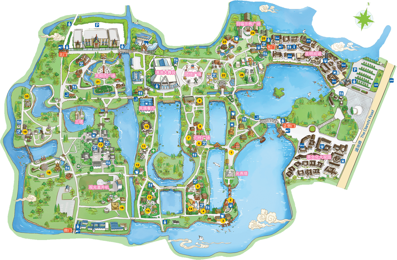 傣族人口約107萬人,主要分布在云南的德宏傣族景頗族自治州、西雙版納傣族自治州及瀾滄江流域的河谷壩子區域。傣族寨是進入民族村的第一個村寨,占地面積27畝,三面環(huán)水,綠樹掩映。一幢幢“干欄式”傣家竹樓,通過蜿延的紅砂石小徑聯向肅穆的緬寺。巍峨壯觀的白塔,精巧玲瓏的風雨橋,以及風雨亭、水井、鐘亭等建筑充滿著傣家的濃郁風情,是傣寨真實的民間景觀再現。一年一度的“潑水節(jié)”期間,這里都有活潑歡快的“象腳鼓舞...
